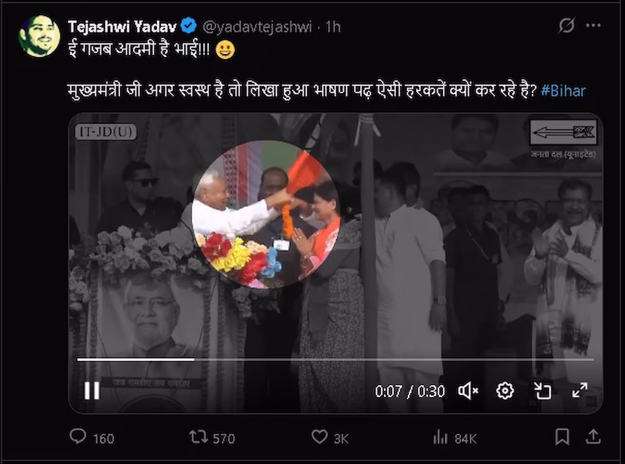 राजद नेता तेजस्वी यादव ने इस घटना का वीडियो सोशल मीडिया प्लेटफॉर्म X (पूर्व ट्विटर) पर साझा करते हुए लिखा —